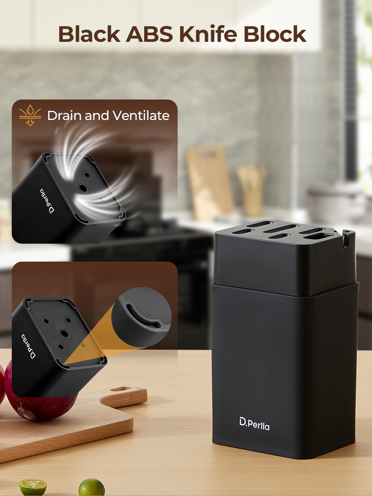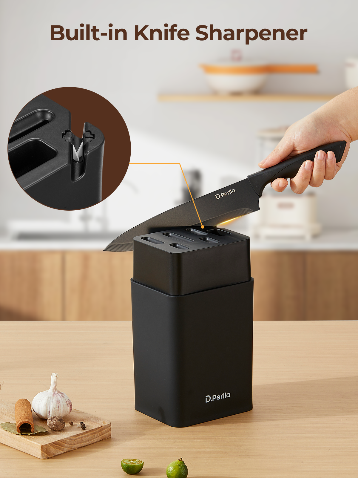 - Space-saving Knife Block with built-in sharpener: 15° cutting angle maintains lasting sharpness and facilitates sharpening. PP material knife block that safely stores and organizes all knives while keeping them easily accessible and protecting blade edges. Compact knife holder design saves cabinet space, making it ideal for rental living